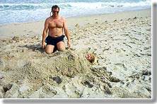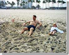 Finally tuckered out, Greg and Brooklyn rest in sand-made chairs while Preston warms up after Susan buried him in the sand. Notice in the background the strength of the wind as it blows the palm trees. We were definitely wind-blown after a day at this beach. |