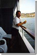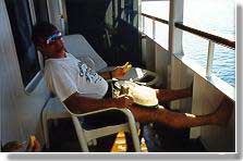 With Mt. Dew in hand, Greg is poised to watch his favorite thing, leaving the dock. Within minutes, room service completes the picture by providing turkey sandwiches setting the scene for another missed dining room dinner, but a perfect sunset view. |