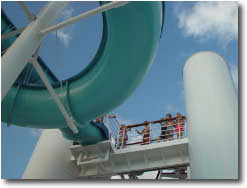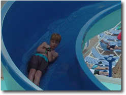 This slide was located in a different spot than the other ships we've been on. It was located on the back of the ship which actually gave you great views of the ocean. Being away from the crowded pools, the waiting line was less since the adults hung out around the pool. Thus, it was usually the kids who were doing the sliding--except for Greg.