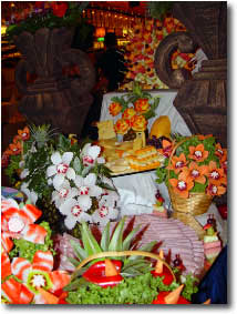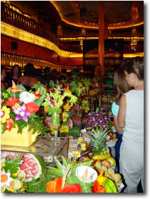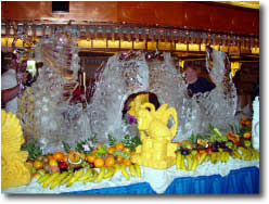On the second formal night, they have the colorful Midnight Buffet. This is where you get to watch the chefs prepare the buffet during the day as you take a galley tour. You can also see the chefs sculpturing the ice sculptures outside by the pools. Then at midnight, you get to travel through the buffet and look at all the food that they prepared. Everything is made up to look like flowers or animals or some other elaborate decoration. After everyone has traveled through the line, you get to go back around and eat all the items.
