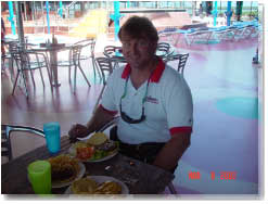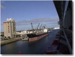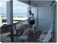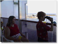 We decided to go up three floors and get Greg his hamburgers as we were all starved since we didn't having breakfast. After Greg was satisfied, we returned to our deck to watch the cast off. Of course, we had to have a ship's boat drill which Susan always hates.