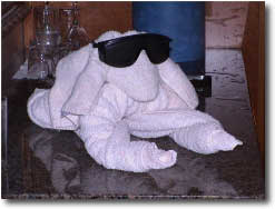 The kids get excited when we return to the room and waiting for them is an animal made out of towels. Each night we have a new and exciting towel design by our room steward.