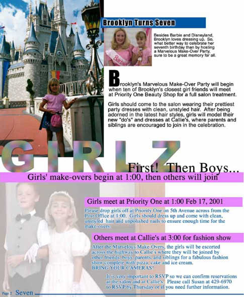 The Marvelous Make-Over party was scheduled for February 17, 2001. Nine of Brooklyn's closest friends were invited to join her at the salon with clean, unstyled hair, dressed in their prettiest party dresses and ready for their first-ever make-over. Reluctantly leaving their little girls, moms and dads were amazed at the transformation when they saw their daughters in the Fashion Show at Callie's Ice Cream Parlor following the make-overs.