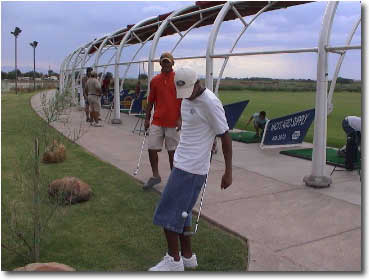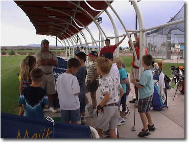 After the storm blew over, Tommy demonstrates a proper swing for the junior golfers before they go back to practicing. |