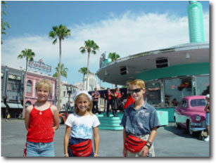 Timing this shot is Susan at her best. The world behind us rotates and it is a challenge to get the self-timer on the camera to go off at just the right time so we can all be in the picture as "Universal" rotates into place. Although the kids want to get going into Universal, they are always willing to stop and pose for pictures. |